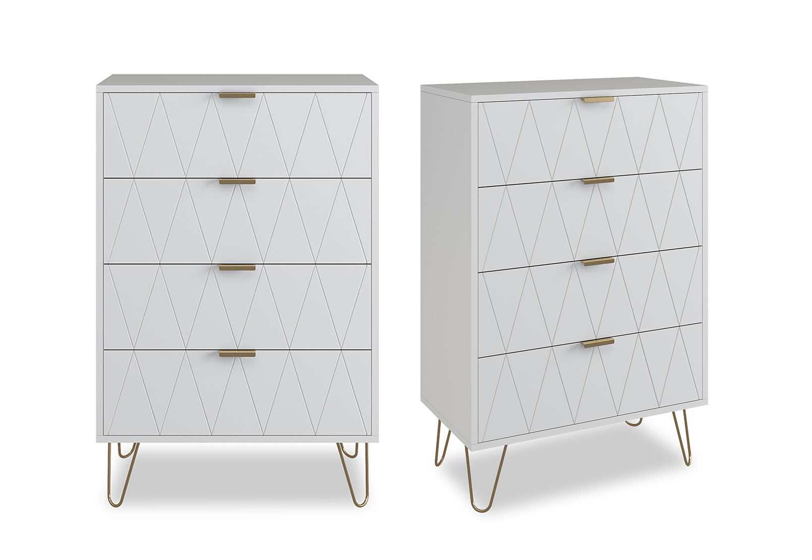- Modern Aesthetic: Crisp white finish with subtle geometric detailing, gold-tone metal handles, and sturdy legs for a sophisticated look.