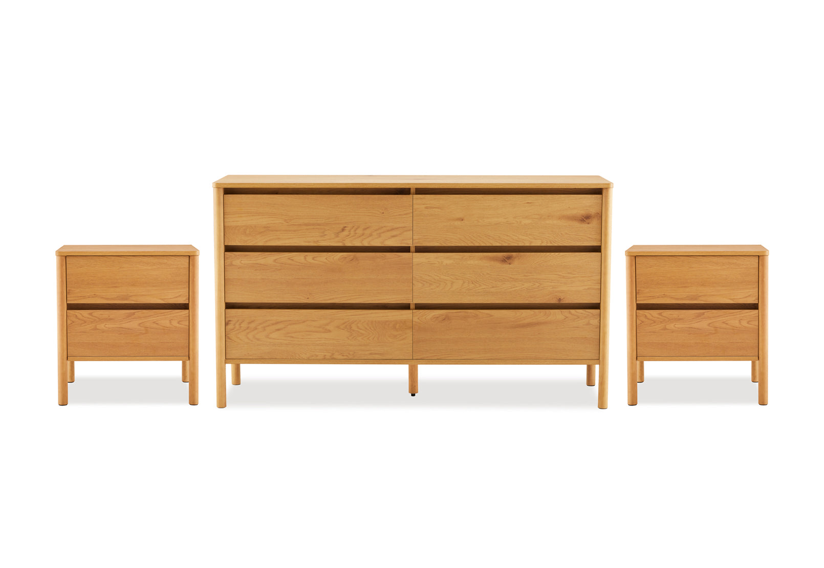 Complete your bedroom with the Dakota 3pce Dresser Bundle—a harmonious blend of natural texture and functional design. Crafted in a relaxed wild oak melamine finish, this set includes one 6 drawer dresser and two 2 drawer bedsides, offering generous storage for clothing, linens, and daily essentials. Each piece is supported by rounded solid oak legs, adding strength, warmth, and a touch of organic charm to your space. Designed to complement both modern and casual interiors, Dakota brings effortless style and practicality to your bedroom.