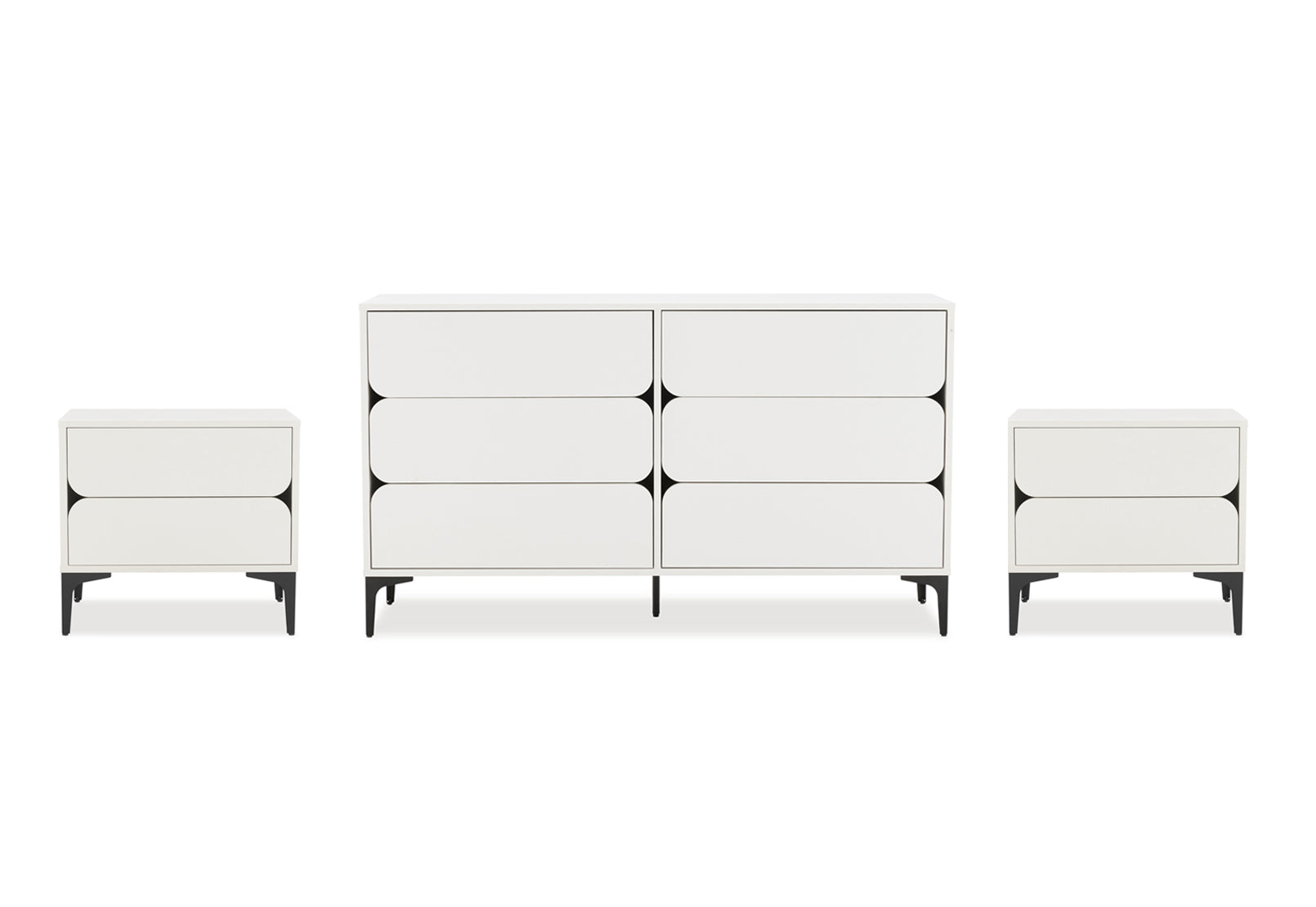 Refresh your bedroom with the Elaine Dresser Bundle: a coordinated trio designed to elevate both form and function. Featuring two bedside tables and one six drawer dresser, each piece is finished in crisp white and anchored by bold black L-shaped legs for a striking architectural contrast. With smooth-glide drawers and a clean, low-profile silhouette, this set offers generous storage while maintaining a refined, contemporary look—perfect for creating a polished space that feels open, organized, and effortlessly stylish.